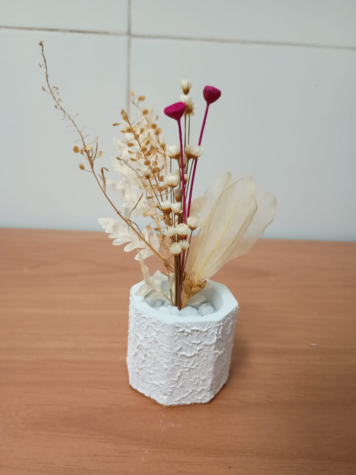 Este vaso é adornado com um arranjo encantador composto por quatro tipos de flores secas, que oferecem beleza duradoura e charme natural. Complementando o arranjo, as pedras dolamitas trazem um toque rústico e elegante, criando um contraste perfeito com a suavidade das flores.